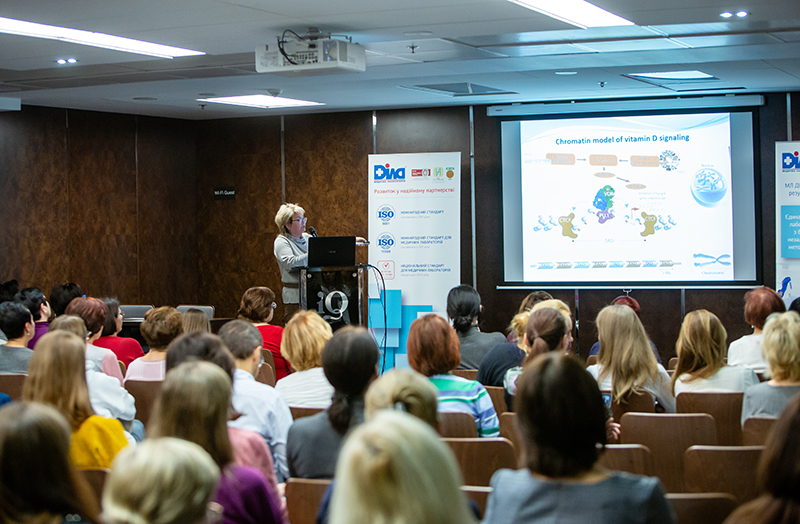 Професор Комісаренко Юлія Ігорівна у своїй доповіді зупинилася на проблемах Д-дефіциту за ендокринних хвороб, а також представила нові дані про вплив Д-дефіциту на розвиток меланоми, раку, цукрового діабету. Були наведені цільові рівні 25-гідроксивітаміну Д для оптимального подолання його дефіциту, новітні можливості фармакологічної корекції.
