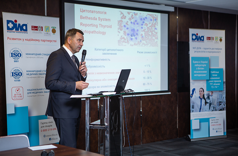 Традиційний професійний захід для ендокринологів, присвячений актуальним діагностичним алгоритмам 2019 року від медичної лабораторії ДІЛА вже вкотре зібрав більше 80 фахівців галузі в м. Київ для вирішення важливих питань та обміну досвідом. Відкрили колегію завідувач кафедри ендокринології Національного медичного університету імені О.О. Богомольця, д.мед.н, професор Комісаренко Юлія Ігорівна і медичний директор медичної лабораторії ДІЛА Сідорова Ірина В’ячеславівна. У своєму вступному слові вони акцентували увагу аудиторії на перевагах лабораторного обстеження при оцінці ендокринних порушень та наступності між ендокринологом, хірургом-ендокринологом, патологом.