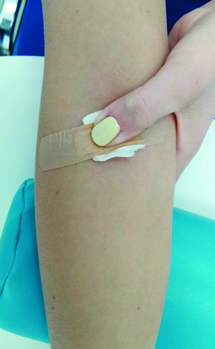 1. Потримати місце венепункції протягом 5-7 хвилин, притискаючи його пальцем другої руки. Руку НЕ ЗГИНАТИ (це забезпечить відновлення кровотоку).