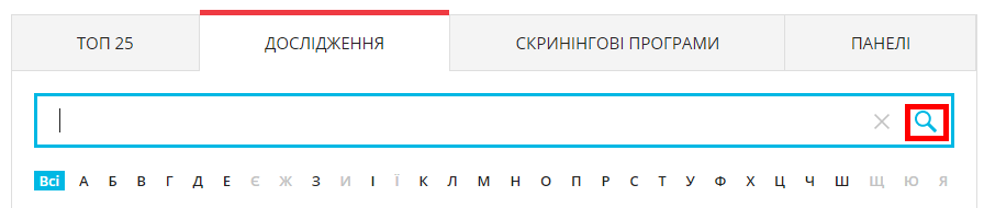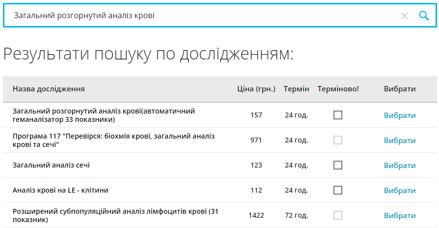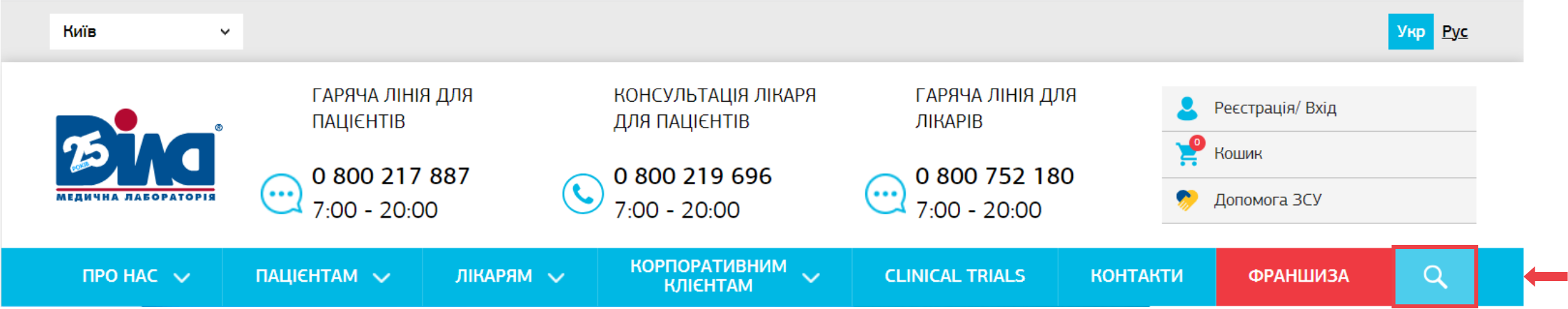 3. Після того, як Ви обрали місто, сайт виведе всю актуальну інформацію щодо найбільш популярних досліджень нашої лабораторії. Якщо необхідного дослідження серед переліку ТОП 25 немає, ви можете скористатися пошуком по всім дослідженням у наступній вкладці «Дослідження». Результати пошуку будуть з’являтися в режимі он-лайн нижче по мірі вводу запиту.