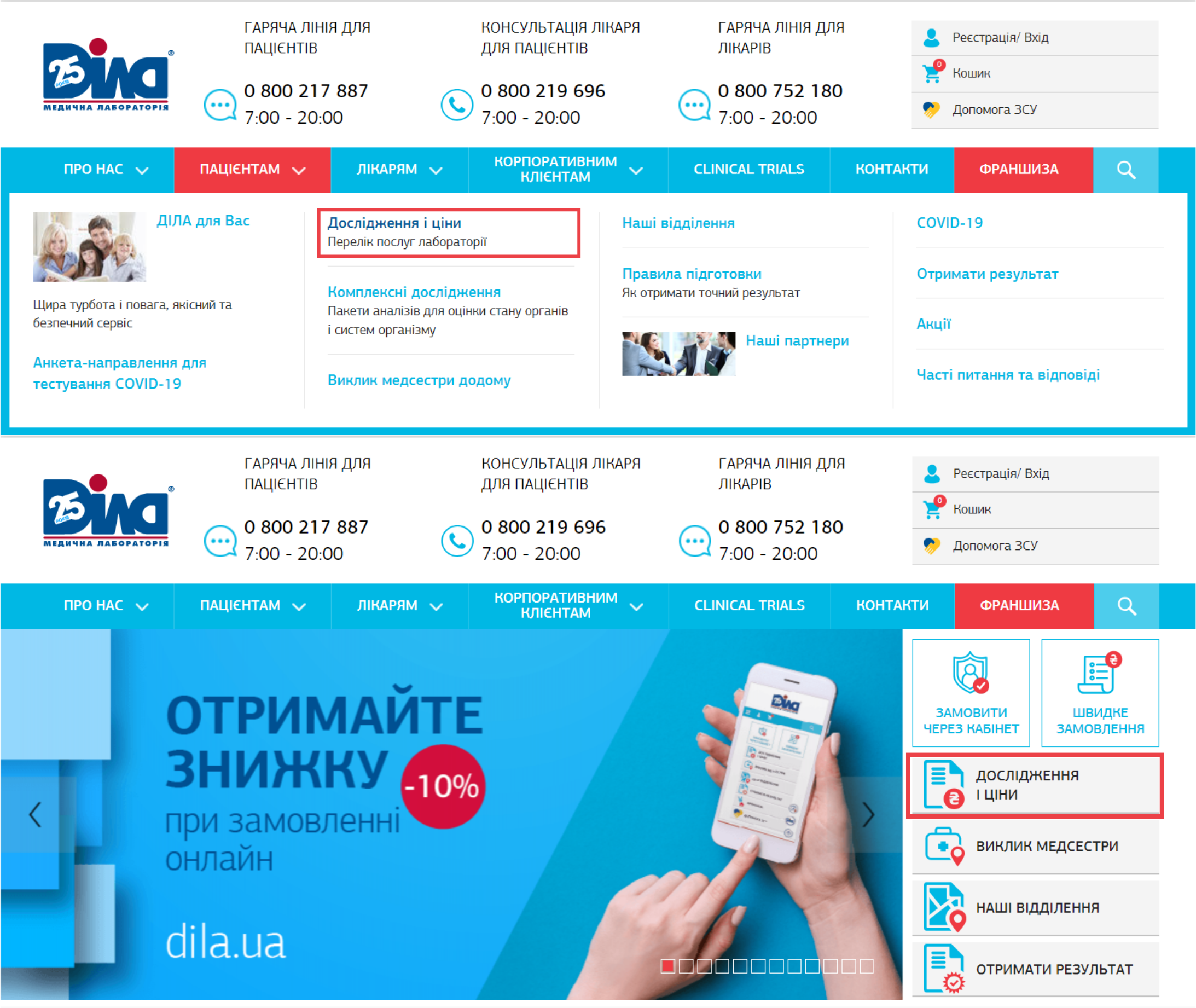 за посиланням, знайти швидкий перехід через кнопку праворуч від слайдера або зайти через головне меню, розділ «Пацієнтам».