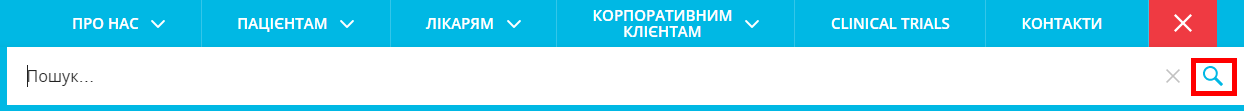 1. Кнопка пошуку знаходиться в правому боці основного меню на сайті.