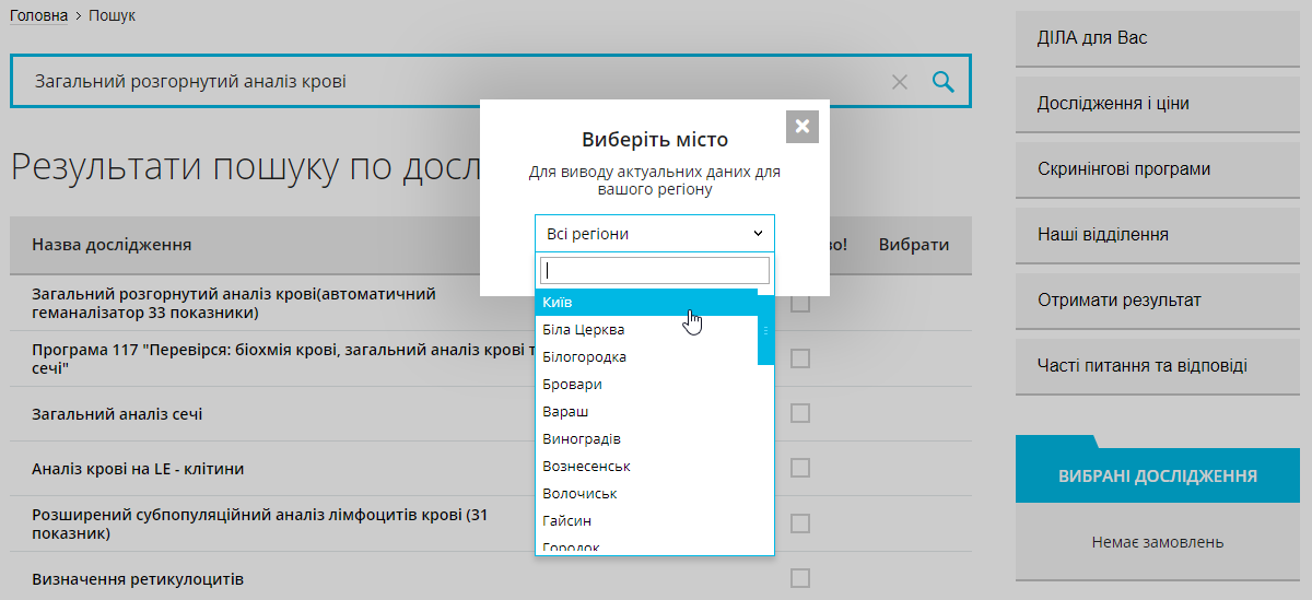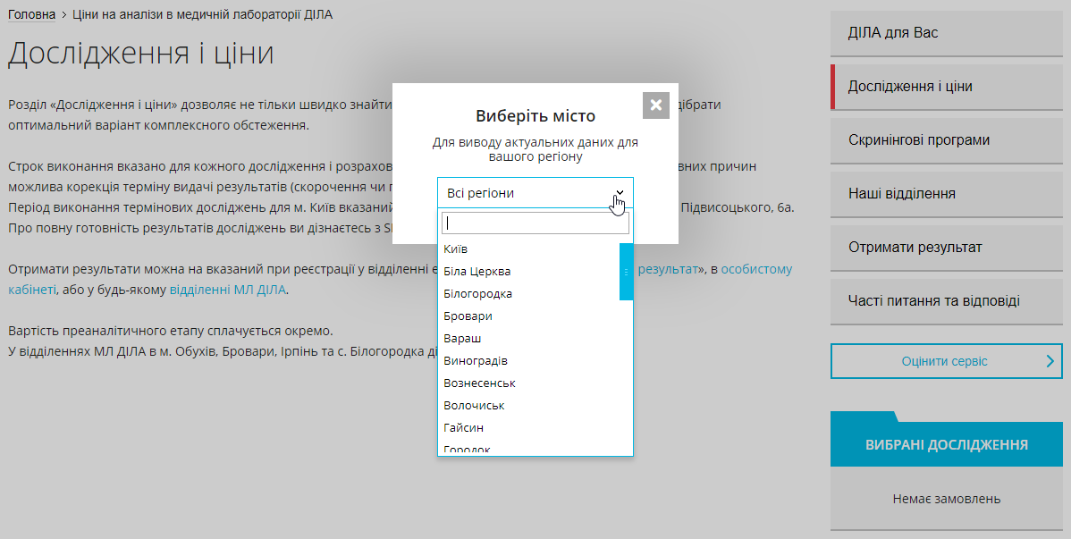 2. Для показу актуальних термінів виконання і вартості досліджень сайт запропонує вам обрати місто, в якому ви плануєте виконати дослідження, якщо воно не було вибране раніше.