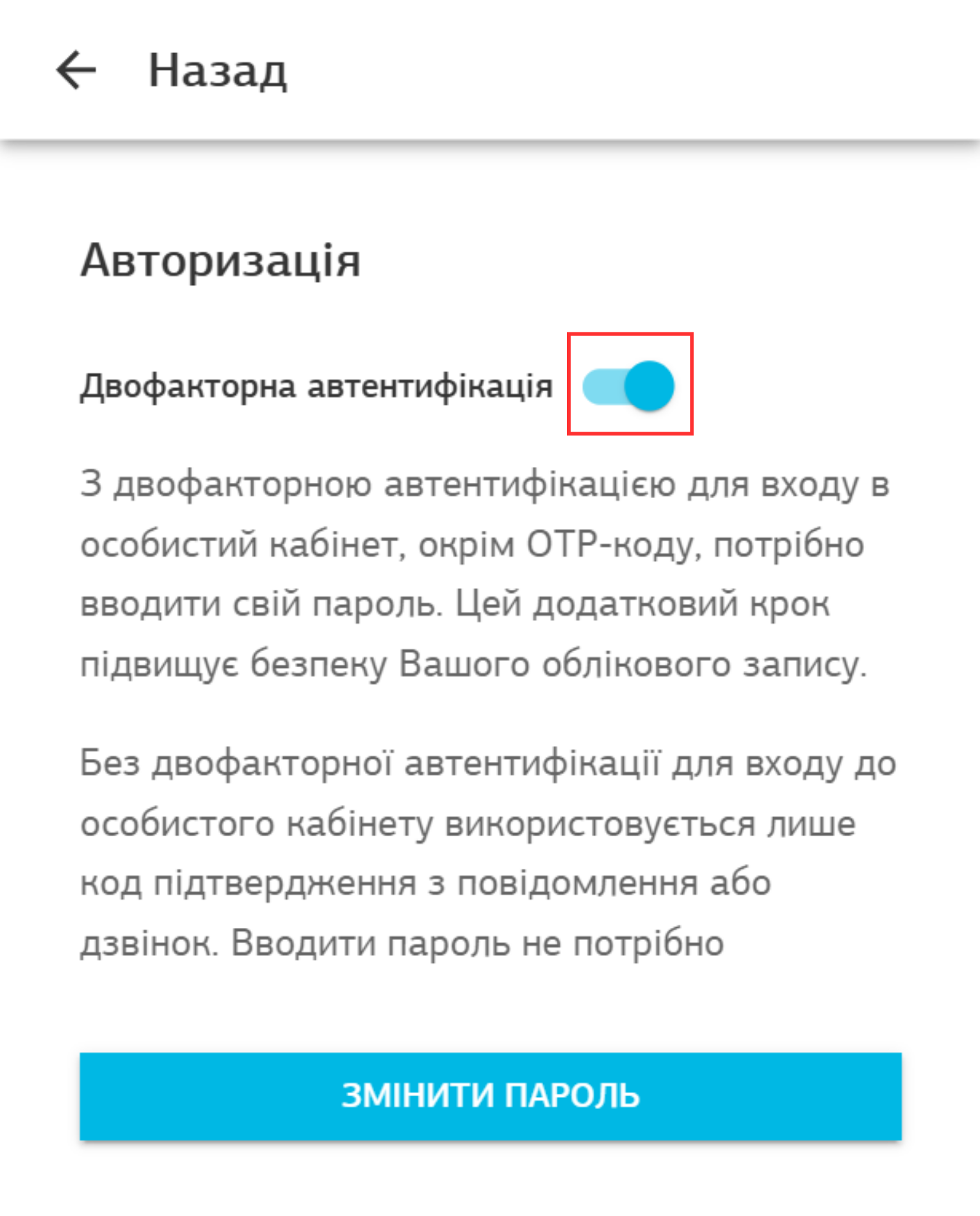 З двофакторною автентифікацією для входу в особистий кабінет, окрім ОТР-коду, потрібно вводити свій пароль. Цей додатковий крок підвищує безпеку вашого облікового запису.
