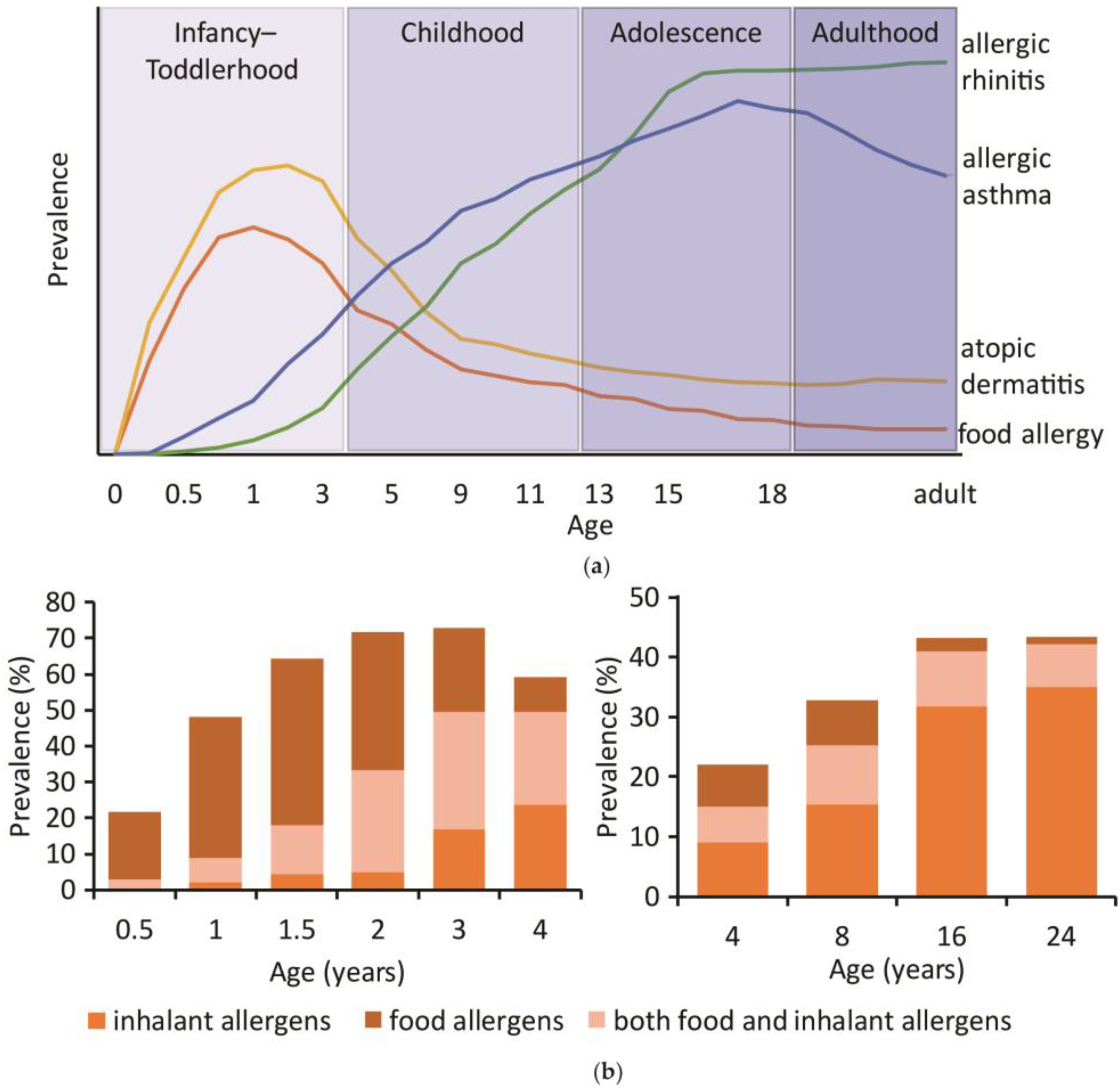 Малюнок 1. Прогресування алергії та сенсибілізації з часом: (а) прогресування алергічних проявів від дитинства до дорослого віку, адаптоване з Tsuge et al. (b) прогресування сенсибілізації до їжі, інгаляційних алергенів, а також харчових і інгаляційних алергенів у дитинстві та дошкільному віці, адаптоване за Chiu et al. та від дитинства до дорослого віку адаптовано з Melén et al.