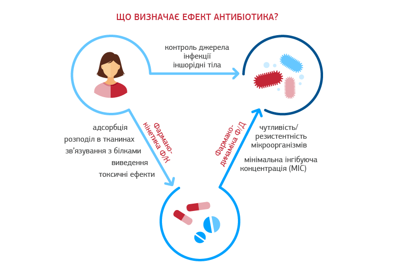 Взаємодія патогена і препарата це фармакодинаміка, вона залежить в першу чергу від чутливості мікроорганізму і наявності у нього маркерів антибіотикорезистентності.