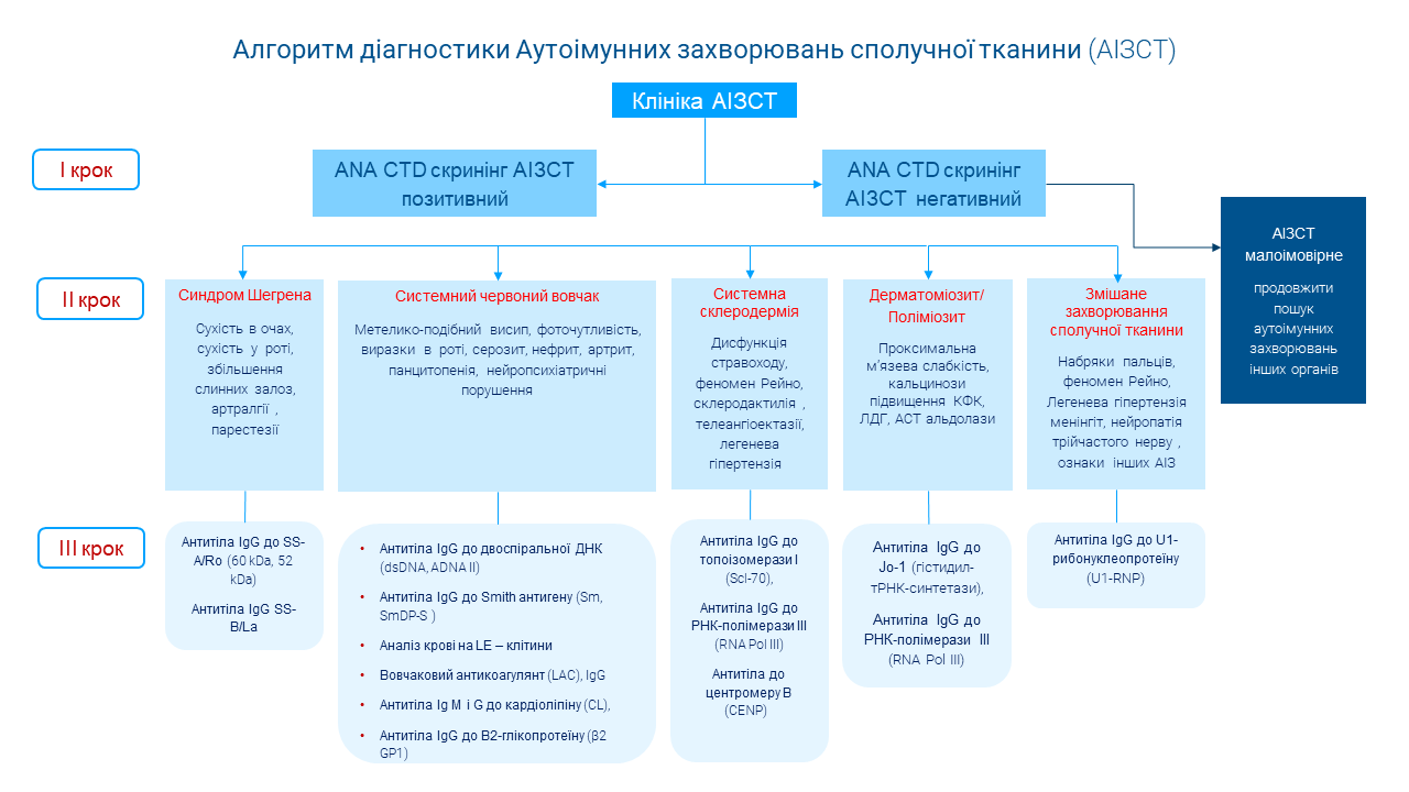 ІІ етап – специфічна діагностика, необхідна для верифікації діагнозу того чи іншого АІЗСТ згідно сучасних рекомендацій. Рекомендовано подальше кількісне визначення окремих сироваткових антинуклеарних антитіл для визначення позитивності відповідно до захворювання, яке підозрюється.