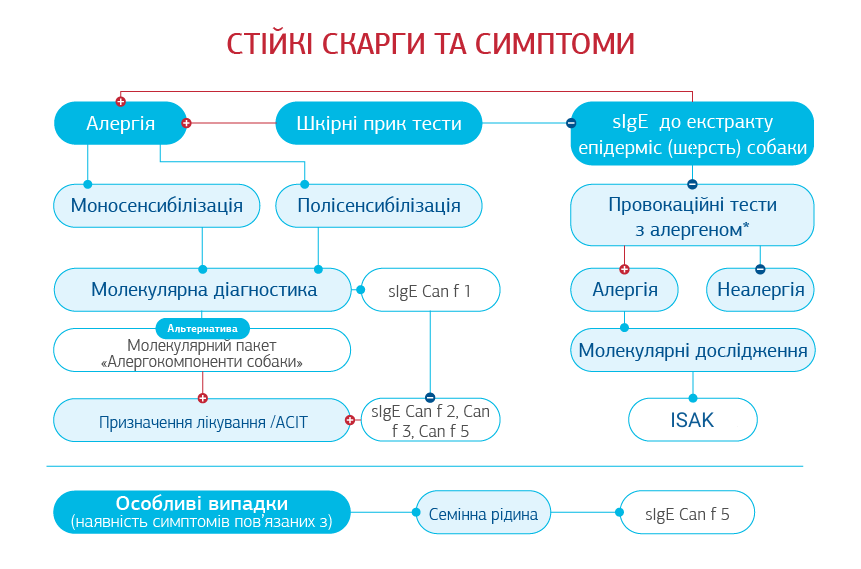 Найбільший спектр молекул собаки входить до складу мультиплексного методу алергодіагностики – ISAC (112 алергенних молекул). Варто призначити дані дослідження пацієнтам, що крім алергії на собаку мають анафілаксію в анамнезі, високий ризик харчової алергії чи велику кількість позитивних тестів з екстрактами алергенів.