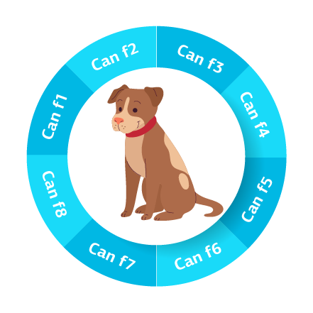 Основними алергенами для собак є Can f 1 і Can f 5 (відомий як простатичний калікреїн, присутній у значній кількості лише у некастрованих самців). Частота сенсибілізації до даних молекул та інших відрізняється в залежності від географічного регіону.