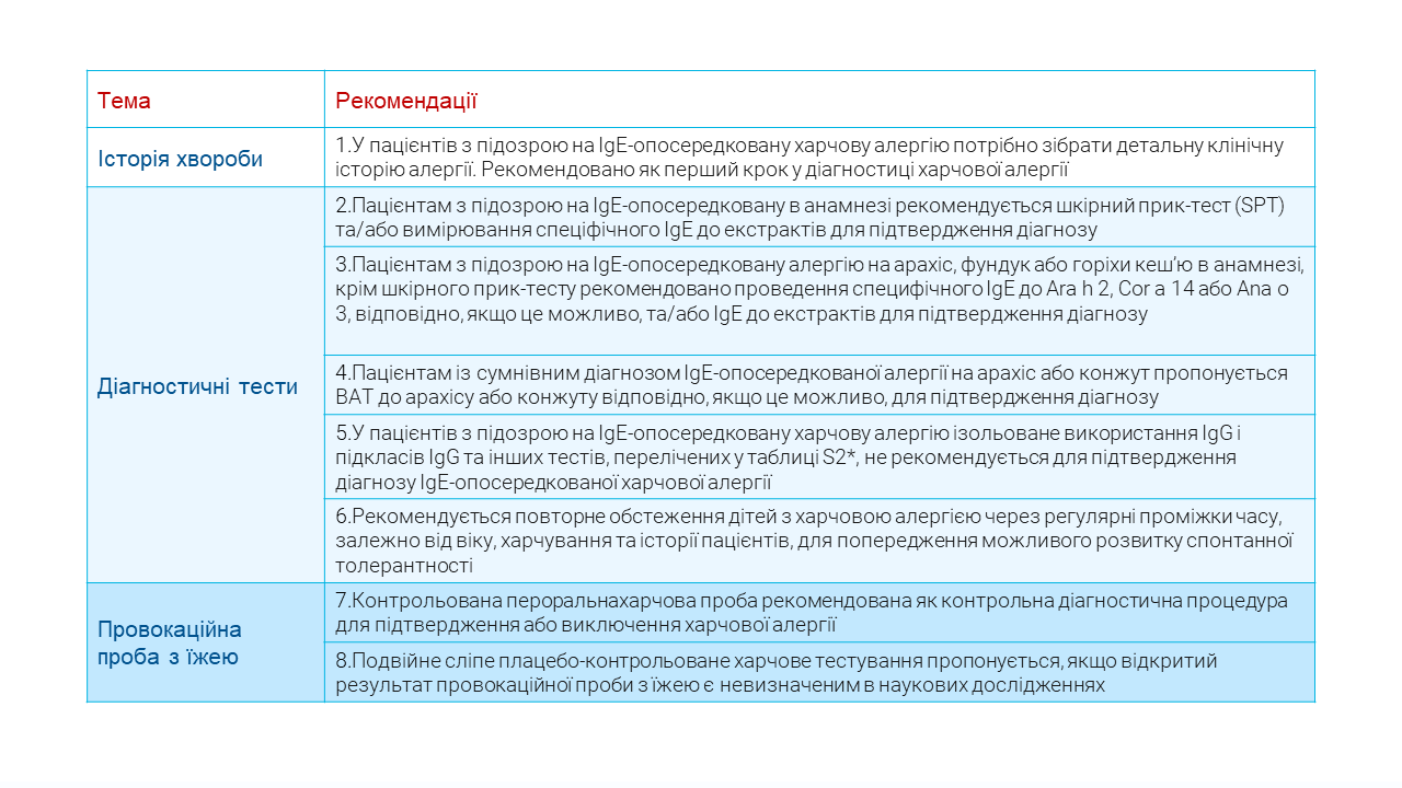 Таблиця1. Рекомендації щодо діагностики IgE-опосередкованої алергії