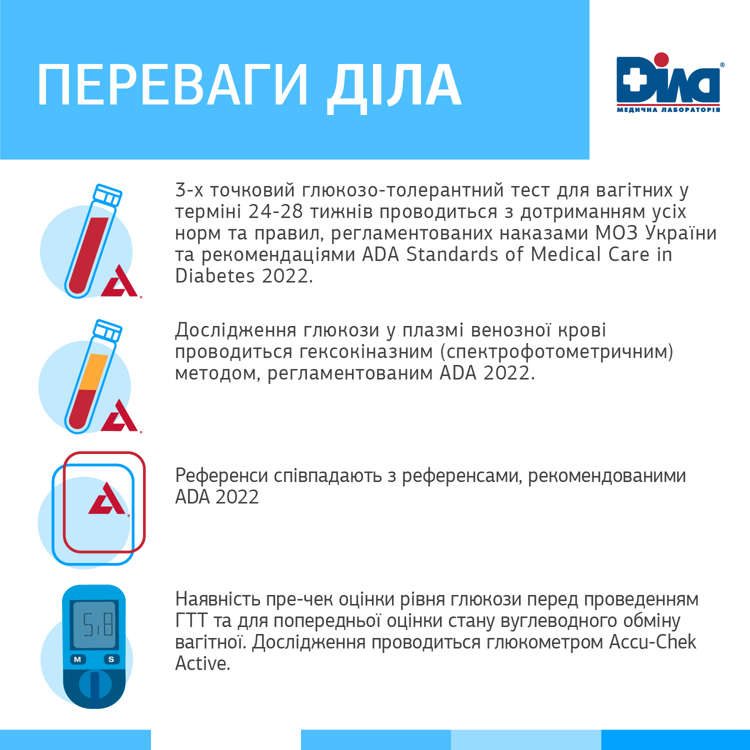 Усім вагітним, які не мають вищенаведених факторів ризику та результат вимірювання глюкози плазми венозної крові у першому триместрі був у межах референтних значень у терміні 24-28 тижнів, згідно з рекомендаціями Американської діабетологічної асоціації (ADA 2022) необхідно проводити глюкозо-толерантний тест: визначення глюкози у плазмі венозної крові натще, через 1 годину та через 2 години після випитих 75 г глюкози.