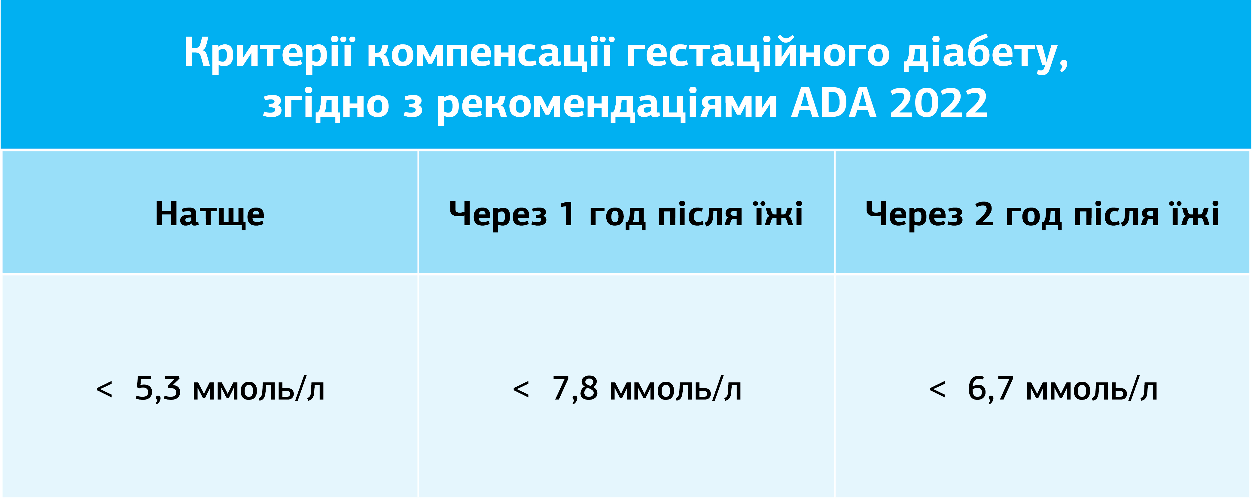 Таблиця 2. Критерії компенсації гестаційного діабету, згiдно з рекомендаціями АDA 2022:
