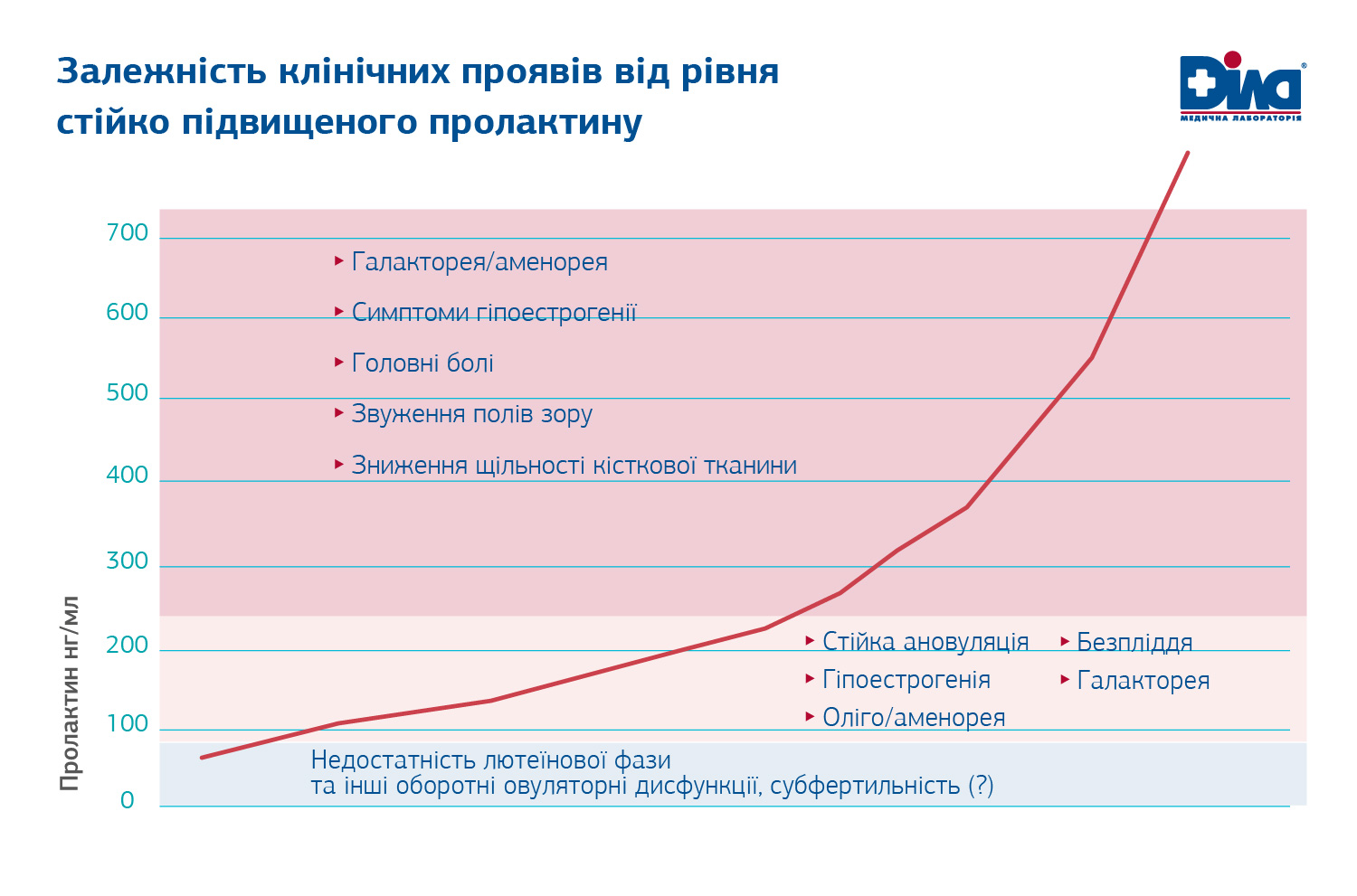 Рівень підвищення пролактину демонструє значну кореляцію з причинами та симптомами. Так, рівні пролактину до 100 нг/мл в переважній більшості випадків викликані непухлинними причинами, а понад 100 нг/мл – гормонсекретуючими пухлинами. Аналогічним чином, підвищення пролактину до 100 нг/мл супроводжуються здебільшого овуляторними дисфункціями і субфертильністю, а вище 100 нг/мл – синдромом галактореї-аменореї, метаболічними та неврологічними порушеннями.