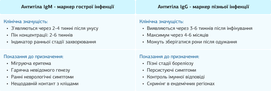 Імуноглобуліни класу M є першими антитілами, які з'являються у відповідь на інфікування Borrelia. Їх виявлення стає можливим через 2-4 тижні після укусу інфікованого кліща, що робить IgM надійним маркером ранньої стадії захворювання. Концентрація IgM досягає максимуму протягом перших 2-6 тижнів від початку інфекції, після чого поступово знижується.