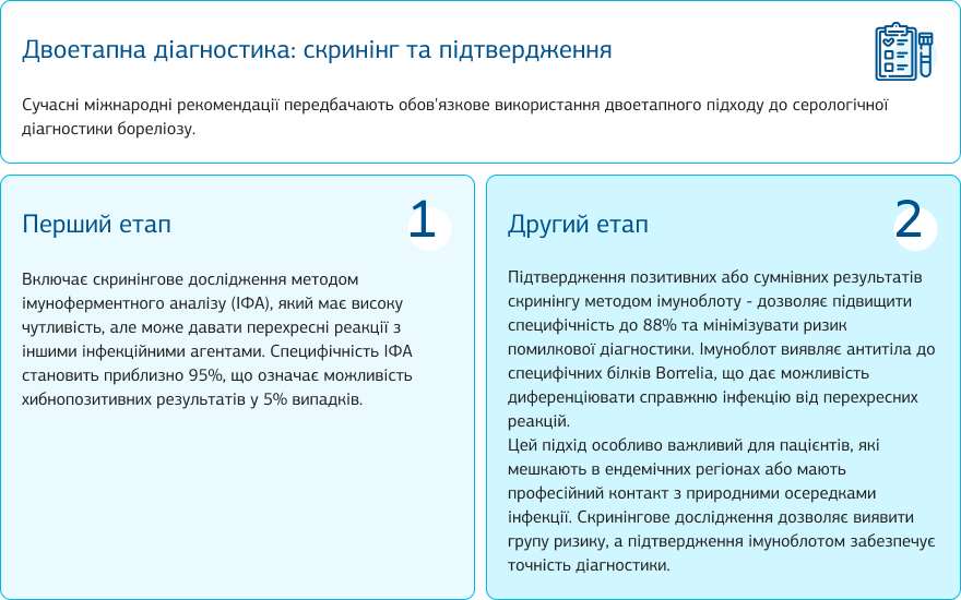 Серологічні методи дослідження залишаються золотим стандартом діагностики бореліозу, особливо в разі типових клінічних проявів. Імунна відповідь на інфікування Borrelia характеризується послідовною появою різних класів антитіл, що дозволяє не тільки підтвердити факт інфікування, а й визначити стадію захворювання.