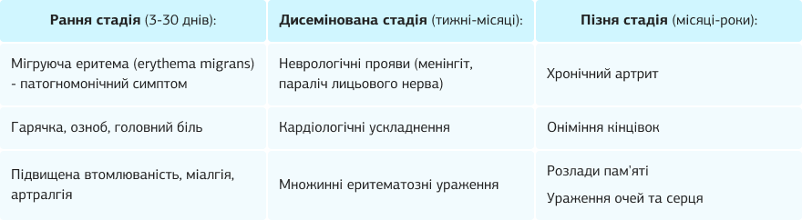 Пізня стадія бореліозу, яка може розвиватися через місяці або навіть роки після первинного інфікування, проявляється хронічним артритом, переважно великих суглобів, персистуючими неврологічними симптомами, включаючи когнітивні порушення та розлади пам'яті. У деяких пацієнтів можуть спостерігатися ураження очей та серця, що значно погіршує якість життя.