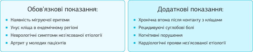 Призначення лабораторних досліджень для діагностики бореліозу повинно базуватися на чіткому розумінні клінічних показань та епідеміологічної ситуації. Найчастіше необхідність в діагностиці виникає при наявності патогномонічних симптомів, таких як мігруюча еритема, особливо якщо пацієнт пам'ятає про укус кліща або перебування в ендемічних регіонах.