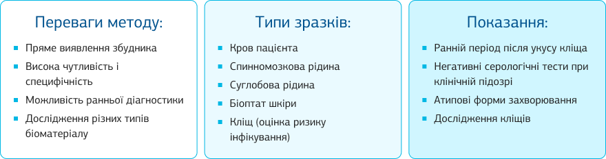 Важливою перевагою ПЛР є можливість раннього виявлення збудника - ще до появи антитіл, що дозволяє розпочати лікування в оптимальні терміни. Цей метод також корисний для дослідження локалізованих осередків інфекції, наприклад, при нейробореліозі або бореліозному артриті.