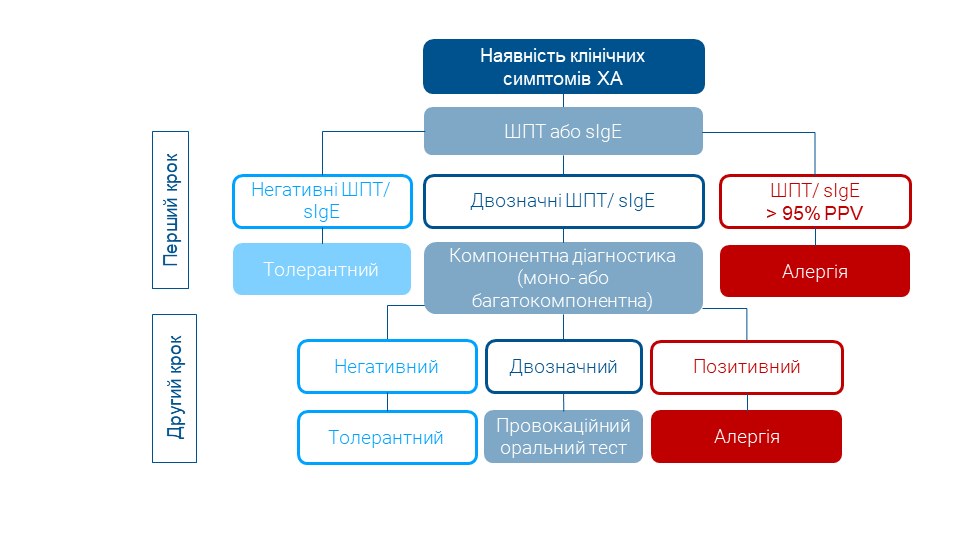 Добре відомі у світі шкірні прик-тести (SPT) і сироватково-специфічні IgE (sIgE) зазвичай використовуються в клінічній практиці та є відносно безпечними та недорогими у виконанні. Однак звичайні позитивні результати (SPT ≥ 3 мм або sIgE ≥ 0,35 kU/L) мають низьку специфічність для клінічної ХА - приблизно половина сенсибілізованих осіб не показує реакції при проведенні тестування Оскільки збільшення величини цих тестів корелює з вищим ризиком реакції, багато досліджень визначили порогові значення для цих тестів із 95% позитивною прогностичною цінністю (PPV) для ХA. Незважаючи на те, що порогові значення SPT і sIgE з 95% PPV до ХA регулярно використовуються для мінімізації потреби в діагностичних харчових пробах, частина пацієнтів залишається в імунологічній сірій зоні; тобто вони чутливі до їжі, але нижче 95% PPV. Терміново потрібні нові підходи, які можуть точно діагностувати ХA. Найбільш точним та рекомендованим сьогодні методом діагностики ХА є діагностика з визначенням компонентів алергену (CRD),оскільки на відміну від використання екстрактів алергенів, CRD вимірює sIgE для окремих білків алергенів. Це є важливим аспектом, і як приклад, систематичний огляд, у якому порівнювали SPT і sIgE до алергенів екстракту арахісу і до його алергокомпонентів, дійшов висновку, що sIgE до алергокомпонентів, зокрема Ara h 2 має більшу діагностичну точність порівняно з іншими тестами.