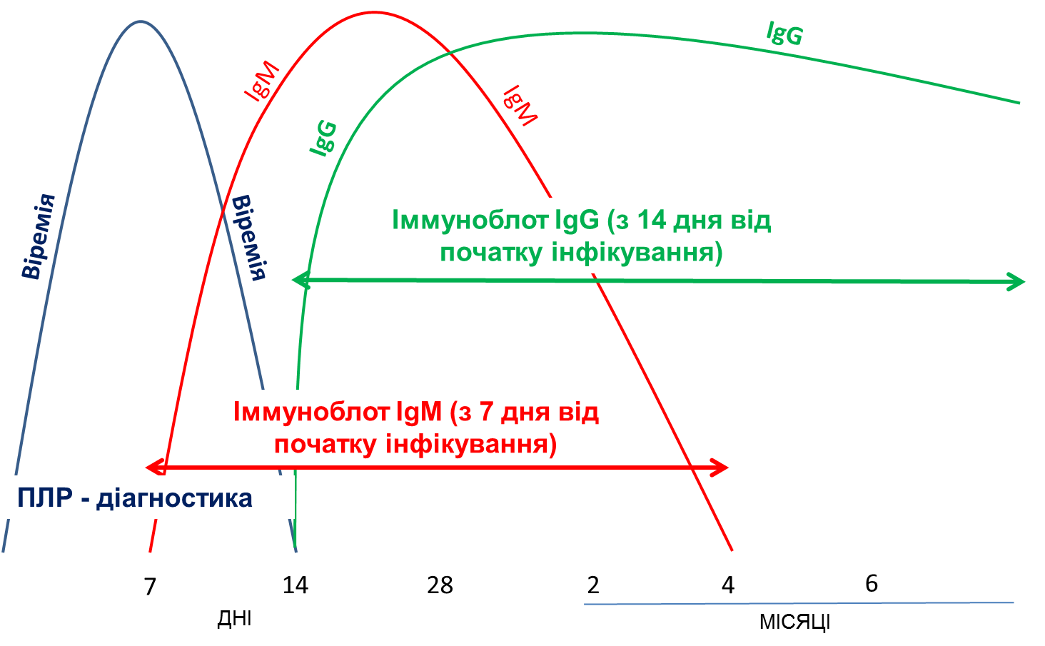 * Після контакту зі збудником існує серологічне вікно, що триває 7-10 днів, протягом яких неможливо виявити ні IgM, ні IgG.