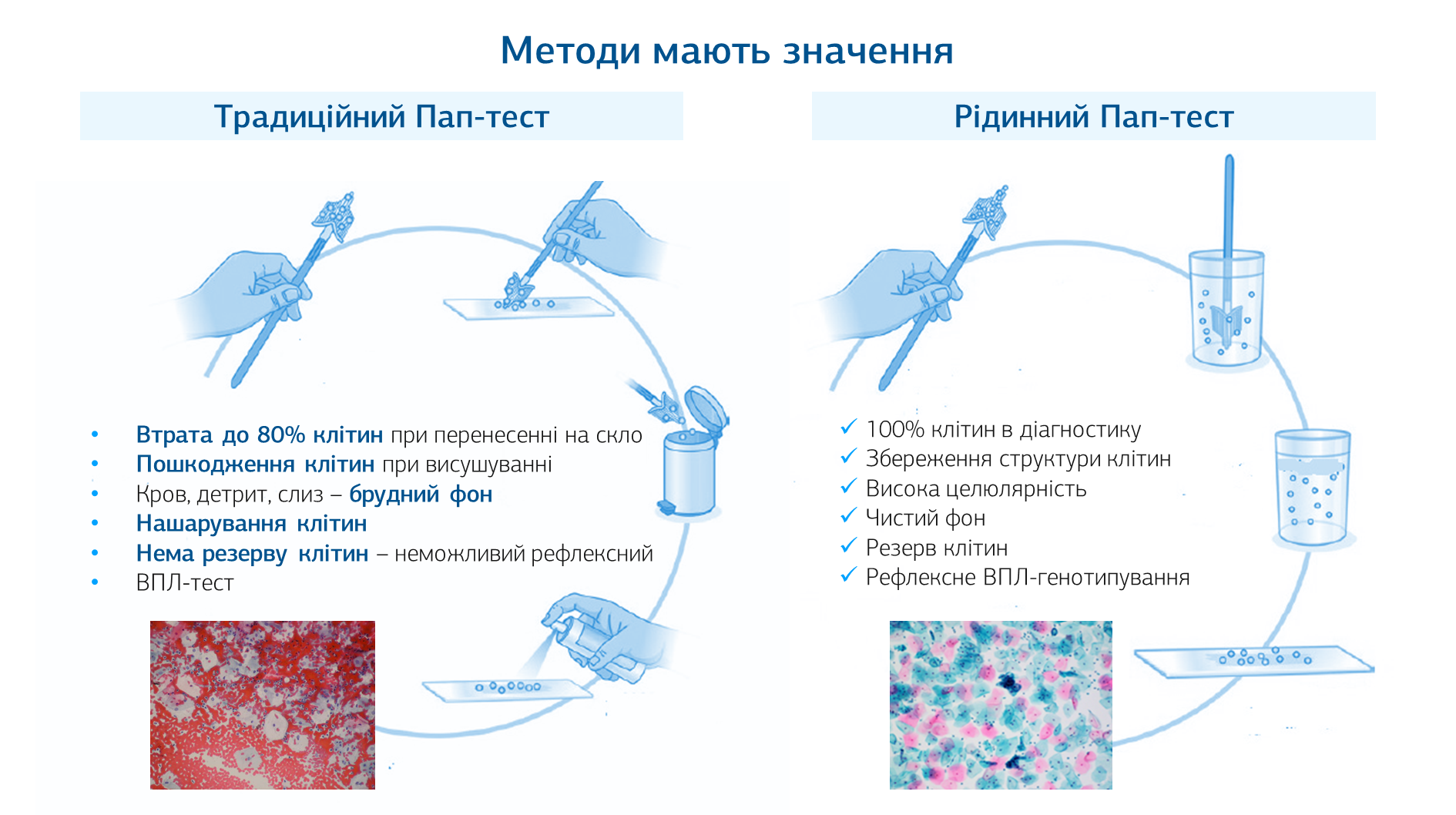 Пап-тест методом рідинної цитології, зокрема методики, рекомендовані для використання в програмах цервікального скринінгу, мають значні переваги порівняно з традиційним Пап-тестом (мазок на склі).