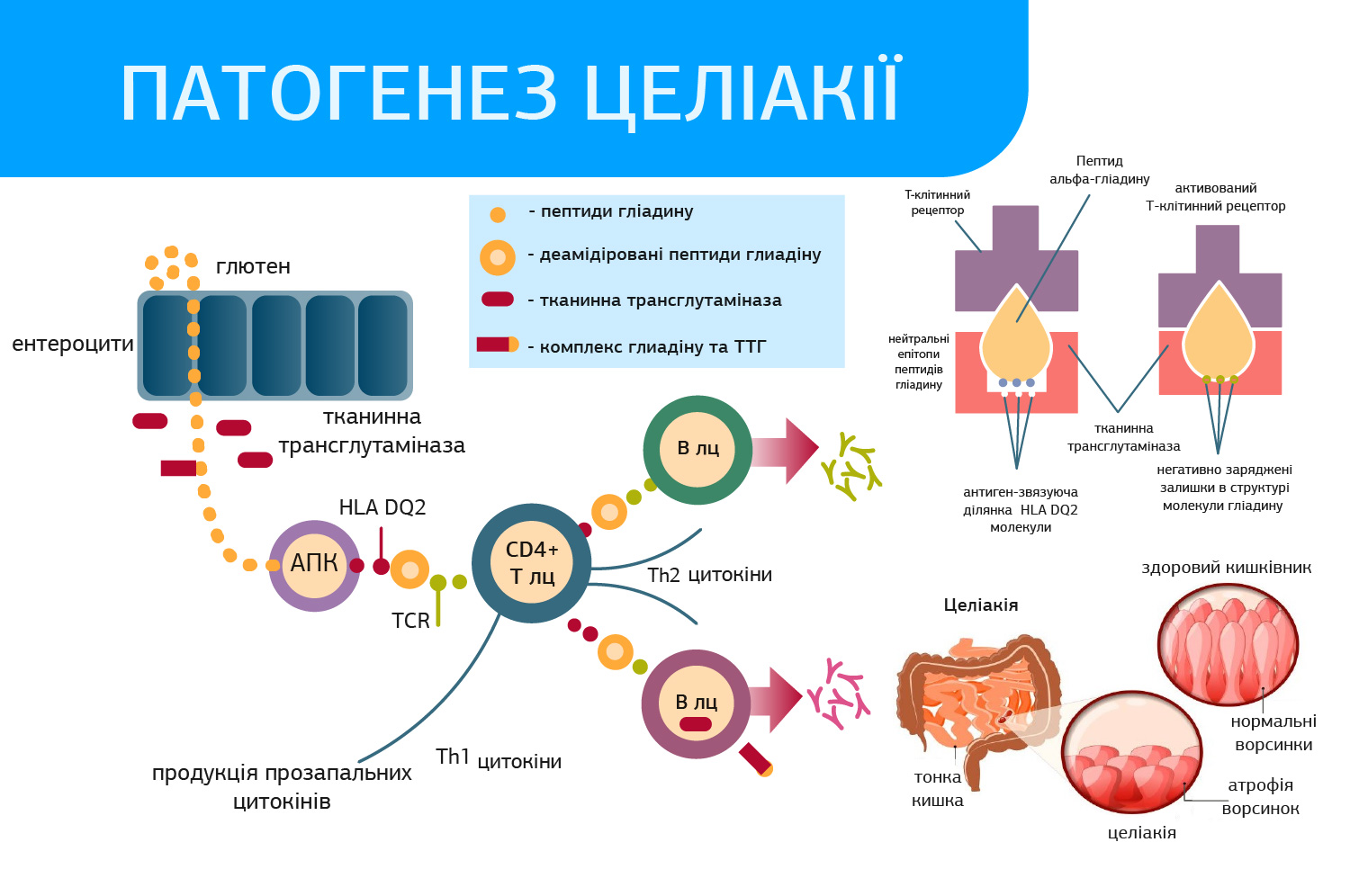 Важливо зазначити, що якщо в раціоні присутній глютен, імунна система хворого на целіакію перебуває під постійним антигенним тиском, внаслідок чого можуть виникати інші аутоімунні захворювання. Під впливом глютену утворюються специфічні антитіла (до тканинної трансглютамінази типу 2 [tTG], антиендомізіальні [EMA], до дезамінованих пептидів гліадину [DGP]) і розвивається аутоімунна запальна реакція, яка призводить до атрофії ворсинок слизової оболонки тонкого кишківника.
