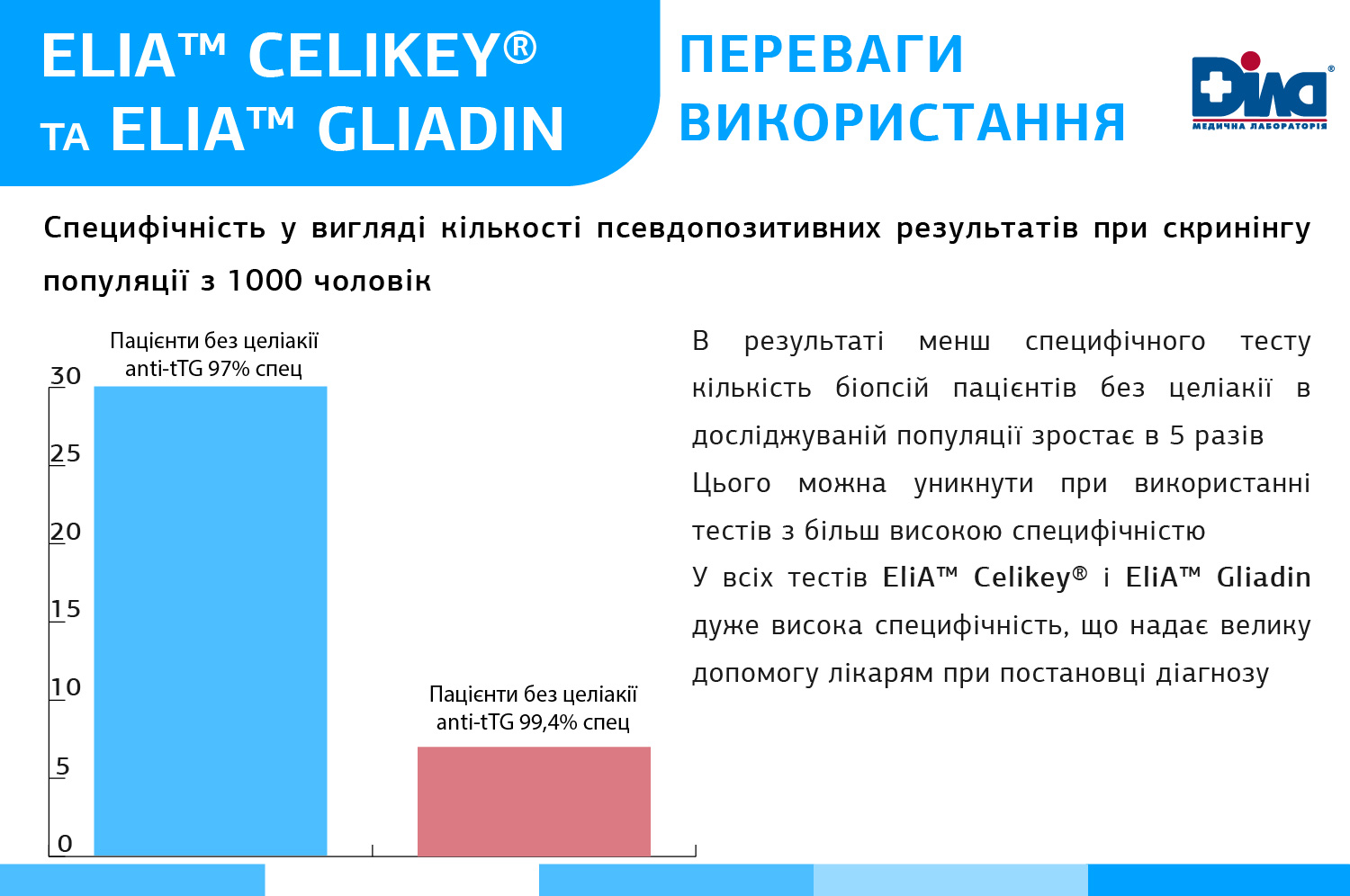 Алгоритм серологічної діагностики глютензалежних захворювань від ДІЛА базується на тестах ДРУГОГО ПОКОЛІННЯ, що відповідає світовим і Європейським тенденціям діагностики. Основні переваги діагностики Целіакії - специфічність та чутливість тестів EliA™ Celikey® і EliA™ Gliadin. (Див. нижче)