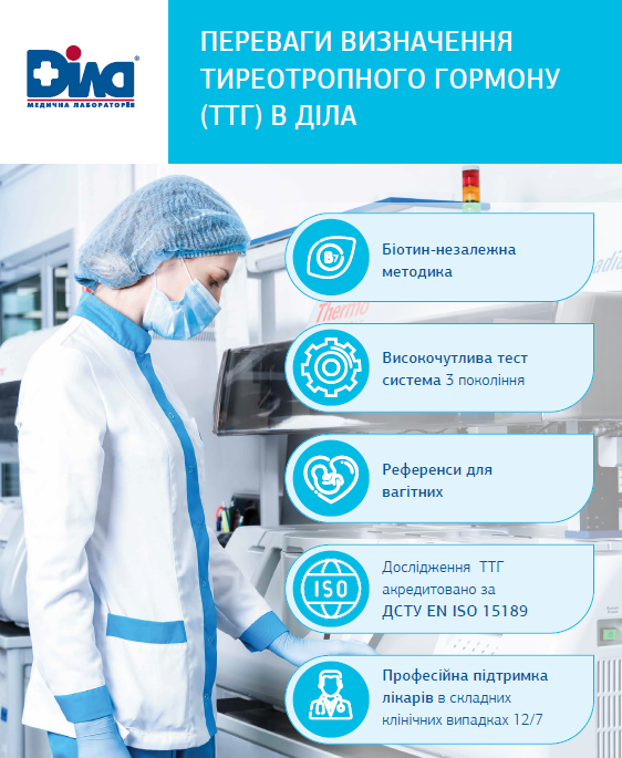 Точність визначення ТТГ має принципове значення в правильній оцінці дисфункції щитоподібної залози. В ДІЛА тиреотропний гормон (ТТГ) визначають біотиннезалежним методом, методикою третього покоління, що виключає вплив факторів інтерференції на результат.