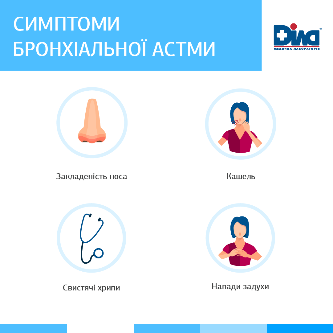 Якщо ж у Вас або у Вашої дитини спостерігаються симптоми, які свідчать про можливий розвиток бронхіальної астми, актуальним буде дослідження від ДIЛА «Пакет «Астма/риніт». Це комплексне дослідження виконується методом ImmunoCAP і відноситься до молекулярної алергодіагностики, що дозволяє проводити обстеження в період загострення і у дітей в ранньому дитячому віці, а також включає в себе широкий перелік алергенів: шерсть домашніх тварин, кліщі домашнього пилу і найбільш поширені рослинні алергени і алергени плісняви.