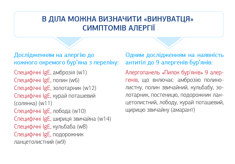 Молекулярний пакет «Бур’яни-1» або Молекулярний пакет «Бур’яни-2» (у випадку проживання на Півдні України, де широко розповсюджені бур’яни, що входять до складу дослідження та можуть бути причиною алергії).