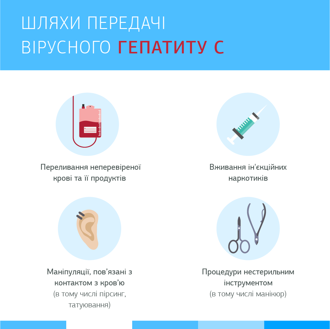 Це вірус, зараження яким найчастіше відбувається при контакті з невеликою кількістю крові. Передача вірусу може мати місце при вживанні ін'єкційних наркотиків, небезпечній медичній практиці, переливанні неперевіреної крові та її продуктів, а також статевих відносинах, які призводять до контакту з кров'ю. Це може відбуватися при переливанні крові та продуктів крові, заражених вірусом гепатиту С (HCV), при ін'єкціях та під час медичних процедур забрудненим медичним інструментом, при вживанні ін'єкційних наркотиків. Можливий також і статевий шлях передачі інфекції, але набагато рідше.