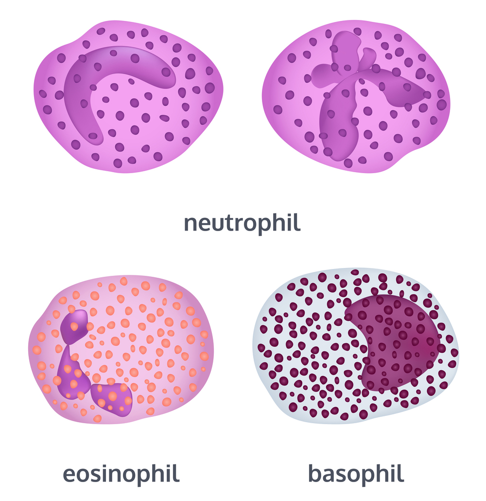 - входять в групу гранулоцитів за рахунок наявності кольорових гранул: еозинофіли, базофіли, нейтрофіли;