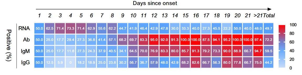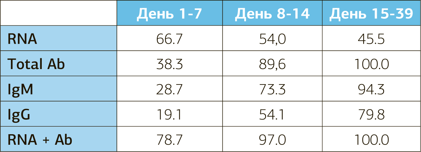 Дослідники зробили висновок, що в залежності від часу, який пройшов від початку коронавірусної хвороби, лабораторні методи досліджень матеріалу з верхніх дихальних шляхів, мають різну діагностичну цінність. Варто поєднувати ПЛР дослідження з серологічними методами, що дозволить збільшити чутливість діагнозу «COVID-19» до 100% з 15 дня хвороби (див. табл).