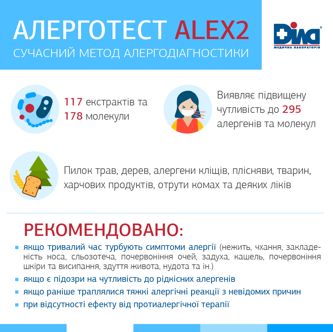 ALEX2 - сучасний багатокомпонентний алерготест, розроблений на основі технології multiplex фахівцями австрійської компанії Macro Array Diagnostics. На сьогодні це один з кращих методів діагностики алергії, який дозволяє одночасно визначити рівень специфічних антитіл до алергенних молекул і екстрактів алергенів у крові, та отримати практично повну картину підвищеної чутливості конкретно у вашому випадку.