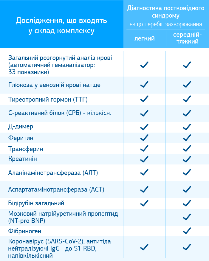 ДІЛА пропонує комплексні дослідження для оцінки постковідного синдрому - Діагностика постковідного синдрому (легкий перебіг захворювання) та Діагностика постковідного синдрому (середньо-тяжкий перебіг захворювання). Вони дозволять своєчасно виявити ризики розвитку серйозних ускладнень і при необхідності призначити лікування.