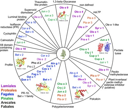До 70% пациентов с респираторными симптомами в районе Средиземноморья являются сенсибилизированными к пыльце оливкового дерева11. Ole e 1 представляет собой основной аллерген этой пыльцы и является эпонимом семейства Ole e 1-подобных белков с гомологами в пыльце деревьев, трав и сорняков. Мажорным аллергеном пыльцы оливкового дерева является Ole e 7 (LTP), ассоциированный с анафилактической реакцией при употреблении фруктов сенсибилизированными пациентами с поллинозом.