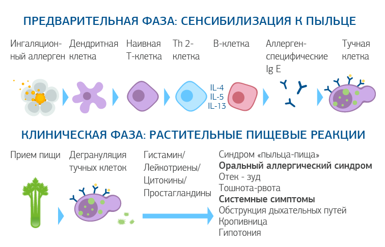 Синдромы «пыльца-пища» возникают за счет пищевых аллергенов 2 класса, которые не могут вызвать периоральную сенсибилизацию, а вызывают аллергические реакции в уже сенсибилизированных ингаляционными аллергенами пациентов.
