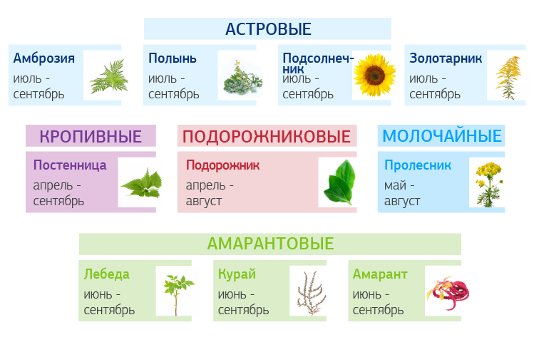 Основные аллергенные сорняки принадлежат к пяти различным семействам: Asteraceae (Астровые), Amaranthaceae (Амарантовые), Urticaceae (Кропивные), Euphorbiaceae (Молочайные) и Plantaginaceae (Подорожниковые).