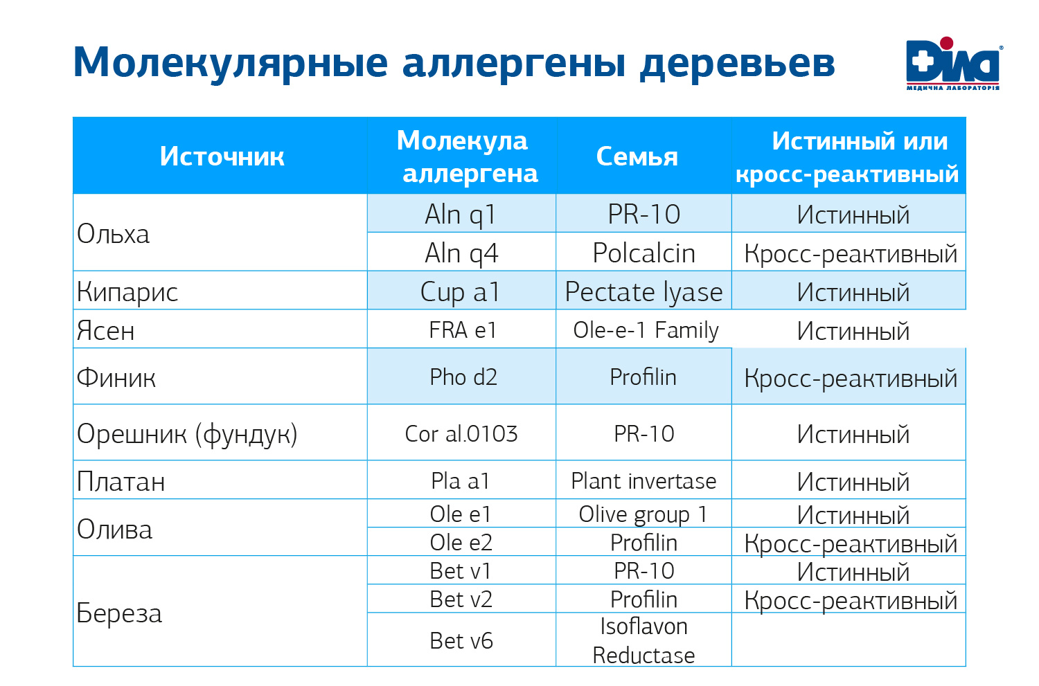 Компонентная диагностика позволяет определять sIgE к конкретной молекуле, отвечающей за развитие симптомов и определить молекулы, отвечающие за перекрестные реакции. Компонент (молекула) пыльцы березы Bet v 1, которая относится к семье PR-10 белков, является главным источником проблем для пациентов с весенней аллергией. Другие деревья семьи Betulaceae и Fagales, пыльца которых способна вызывать симптомы также имеют схожие молекулы.