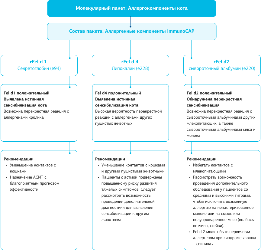 Такой состав пакета позволяет узнать связаны ли симптомы с настоящей аллергией к коту или с перекрестными реакциями с аллергенами из других источников, в частности, других животных - собаки, лошади, мыши.