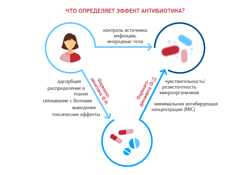Взаимодействие патогена и препарата это фармакодинамика, она зависит в первую очередь от чувствительности микроорганизма и наличия у него маркеров антибиотикорезистентности.