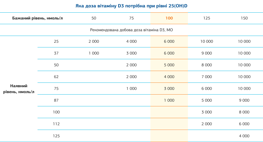 Пример: для того, чтобы увеличить концентрацию в крови с 62 нмоль/л до 100 нмоль/л необходимо дополнительно принимать по 4000 МЕ холекальциферол/витамин D3.
