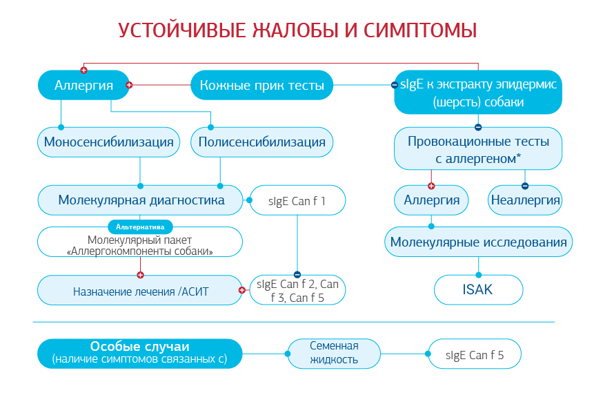 Наибольший спектр молекул собаки входит в состав мультиплексного метода аллергодиагностики – ISAC (112 аллергенных молекул). Следует назначить данные исследования пациентам, которые кроме аллергии на собаку имеют анафилаксию в анамнезе, высокий риск пищевой аллергии или большое количество положительных тестов с экстрактами аллергенов.