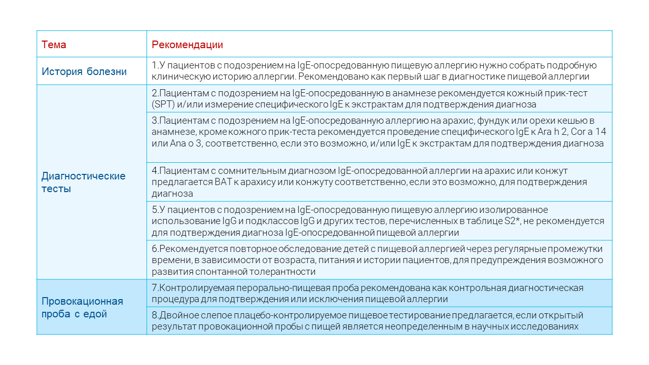 Таблица1. Рекомендации по диагностике IgE-опосредованной аллергии