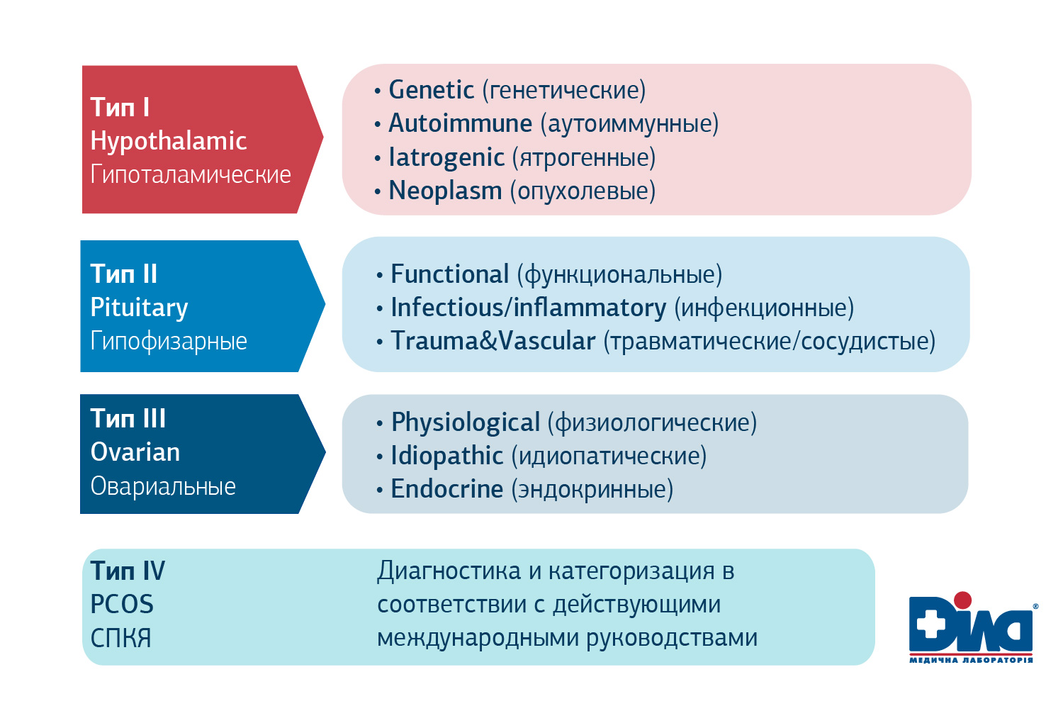И каждая из таких причин может иметь место на уровне: гипоталамуса, гипофиза или яичников. Синдром поликистозных яичников в новой классификации FIGO 2022 выделяют в отдельную овуляторную дисфункцию, поскольку при нем нарушения имеют место на всех указанных уровнях, а причины их не до конца ясны.