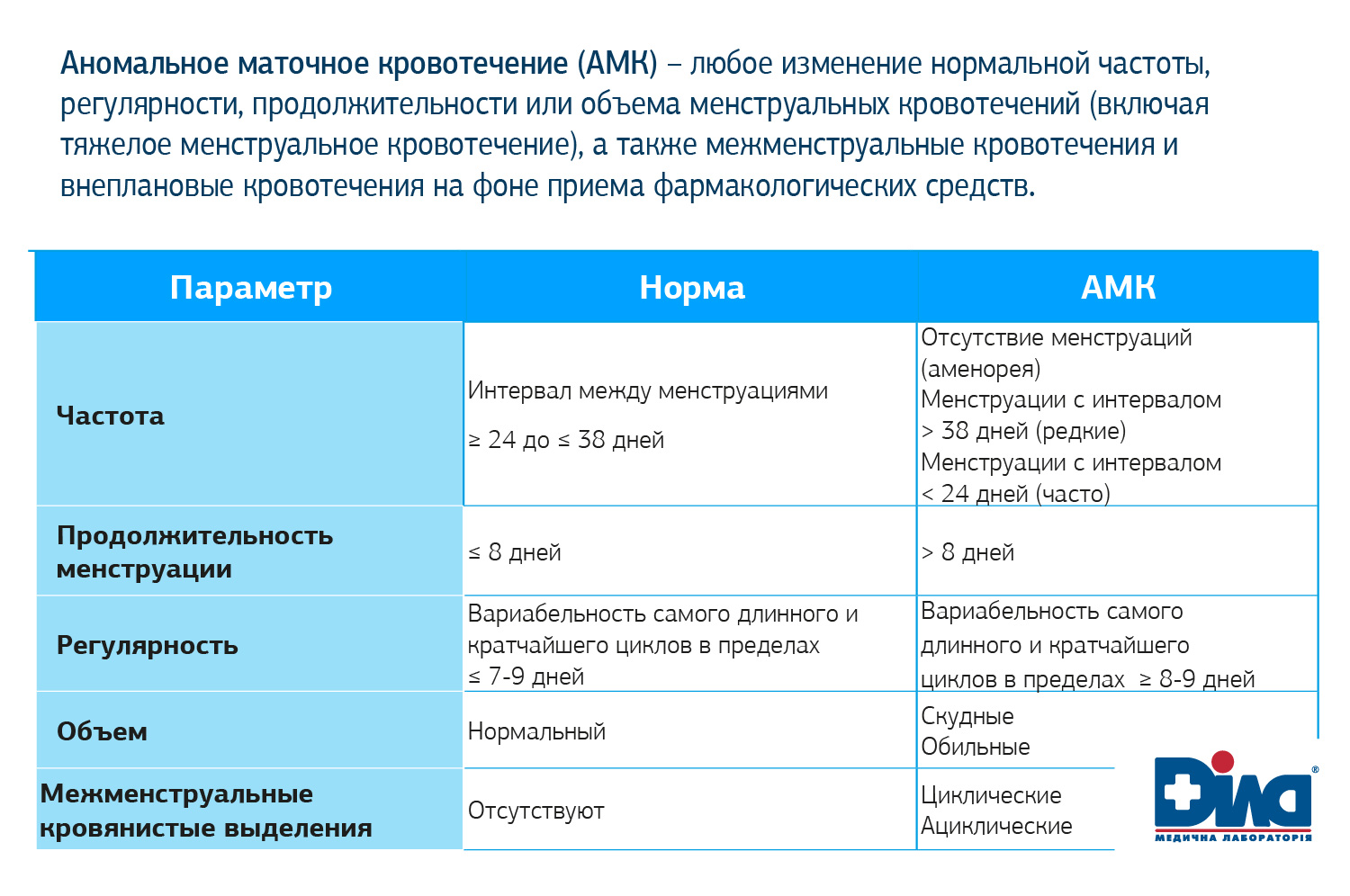 Показанием к обследованию является отклонение характеристик менструального цикла от нормальных, то есть аномальных маточных кровотечений (см. таблицу), а также отсутствие беременности в течение 12 месяцев регулярной половой жизни.