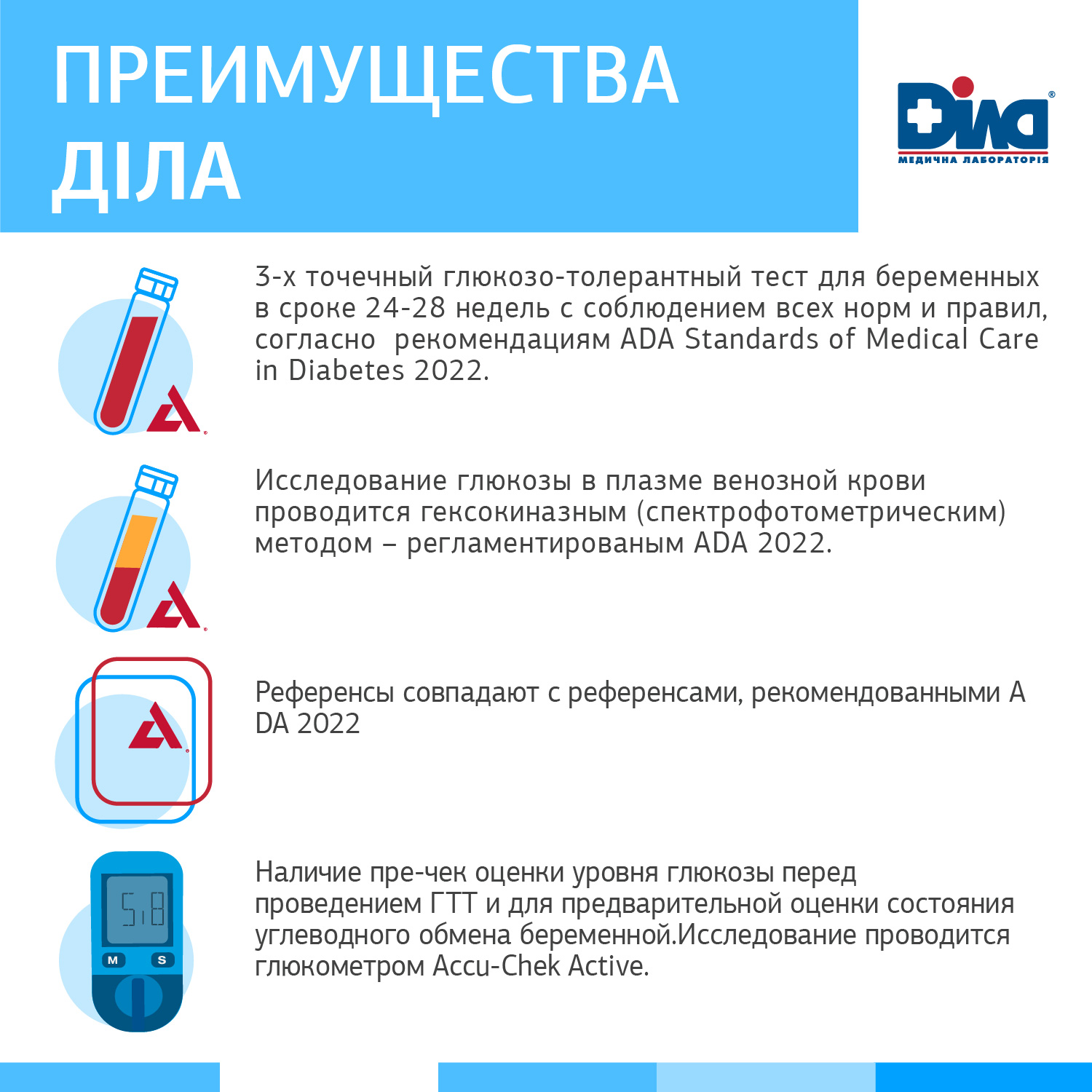Всем беременным, не имеющим вышеприведенных факторов риска и результат измерения глюкозы плазмы венозной крови в первом триместре был в пределах референтных значений в сроке 24-28 недель, согласно рекомендациям Американской диабетологической ассоциации (ADA 2022) необходимо проводить глюкозо-толерантный тест: определение в плазме венозной крови натощак, через 1 час и через 2 часа после выпитых 75 г глюкозы.