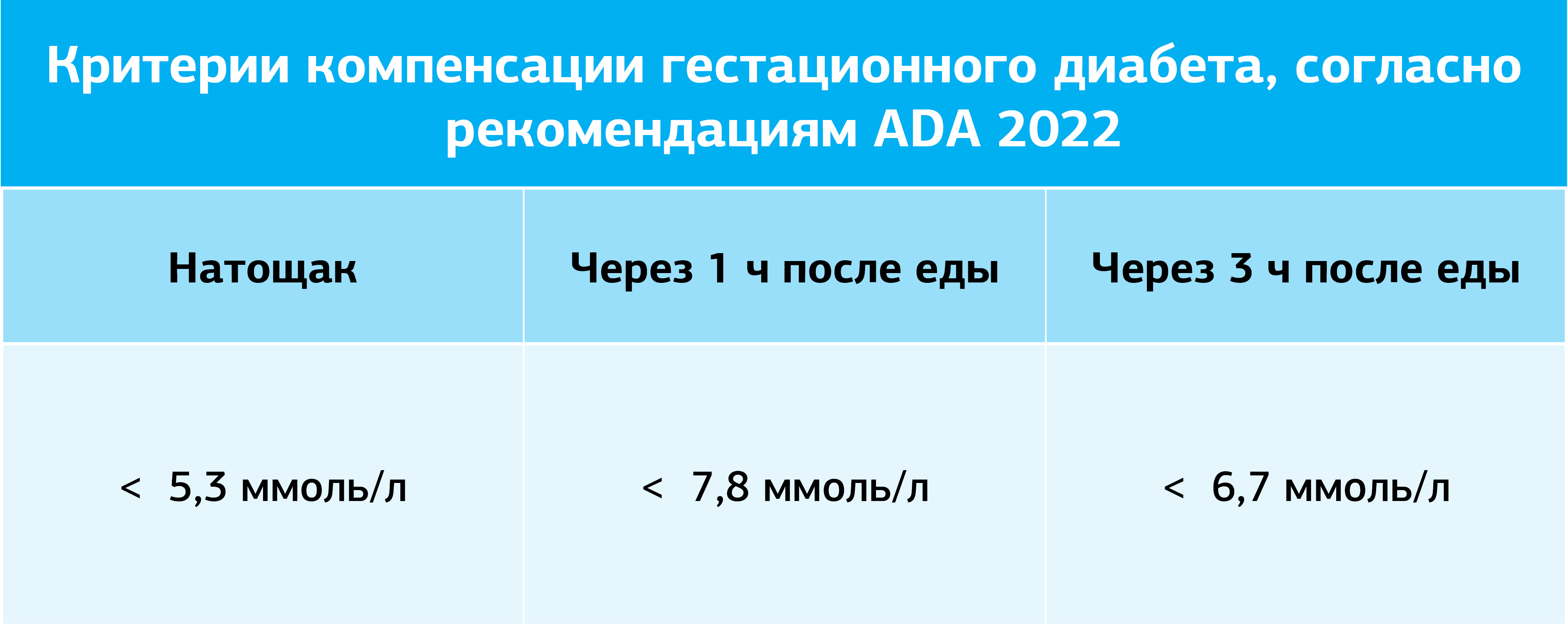 Таблица 2. Критерии компенсации гестационного диабета, согласно рекомендациям АDA 2022: