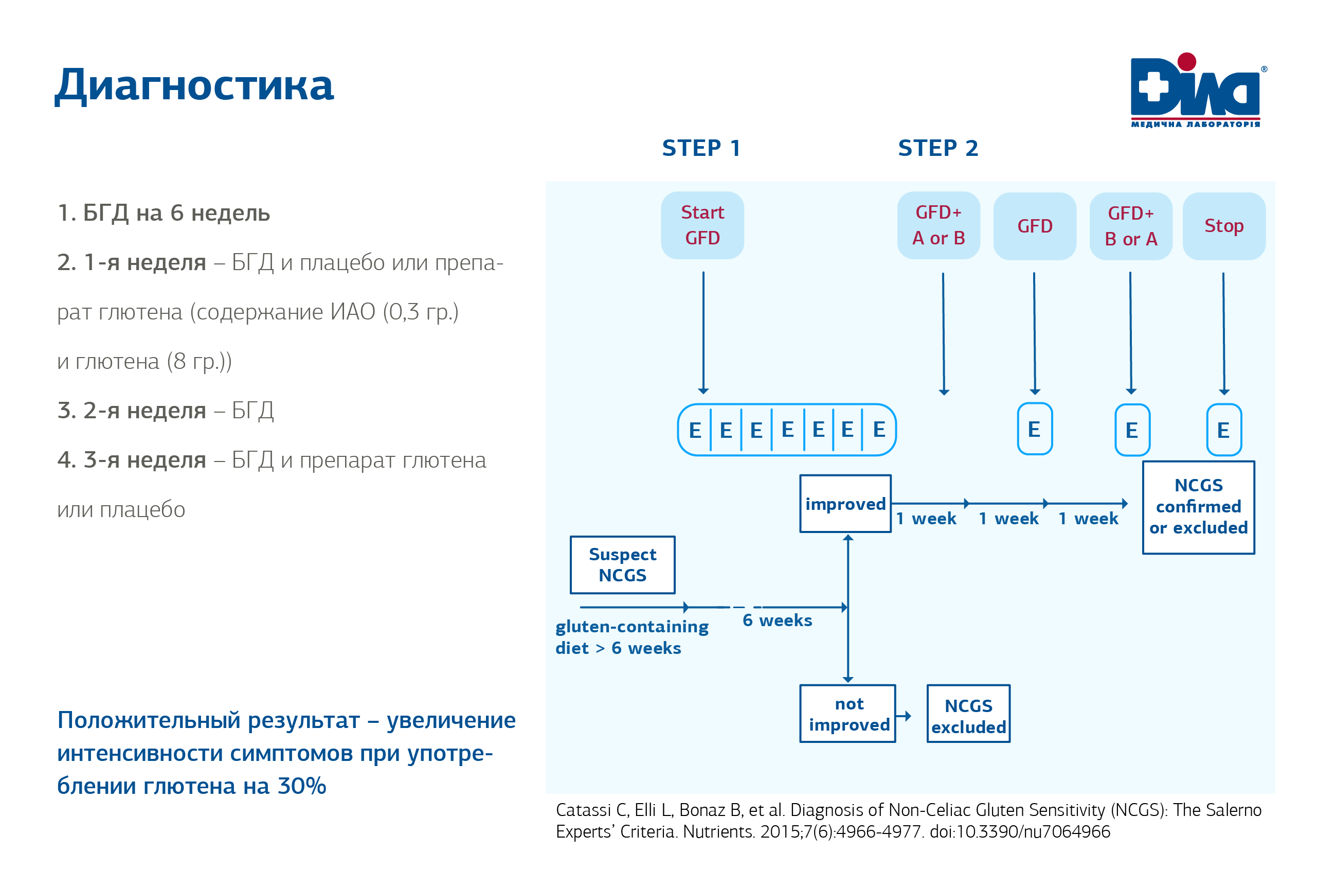 - Catassi C., Elli L., Bonaz B. et al. Diagnosis of non-celiac gluten sensitivity (NCGS): the Salerno Experts’ Criteria. Nutrients 2015; 7: 4966-4977. https://www.vz.kiev.ua/neperenosymist-glyutenu-bez-tseliakiyi-yak-diagnostuvaty-i-likuvaty/