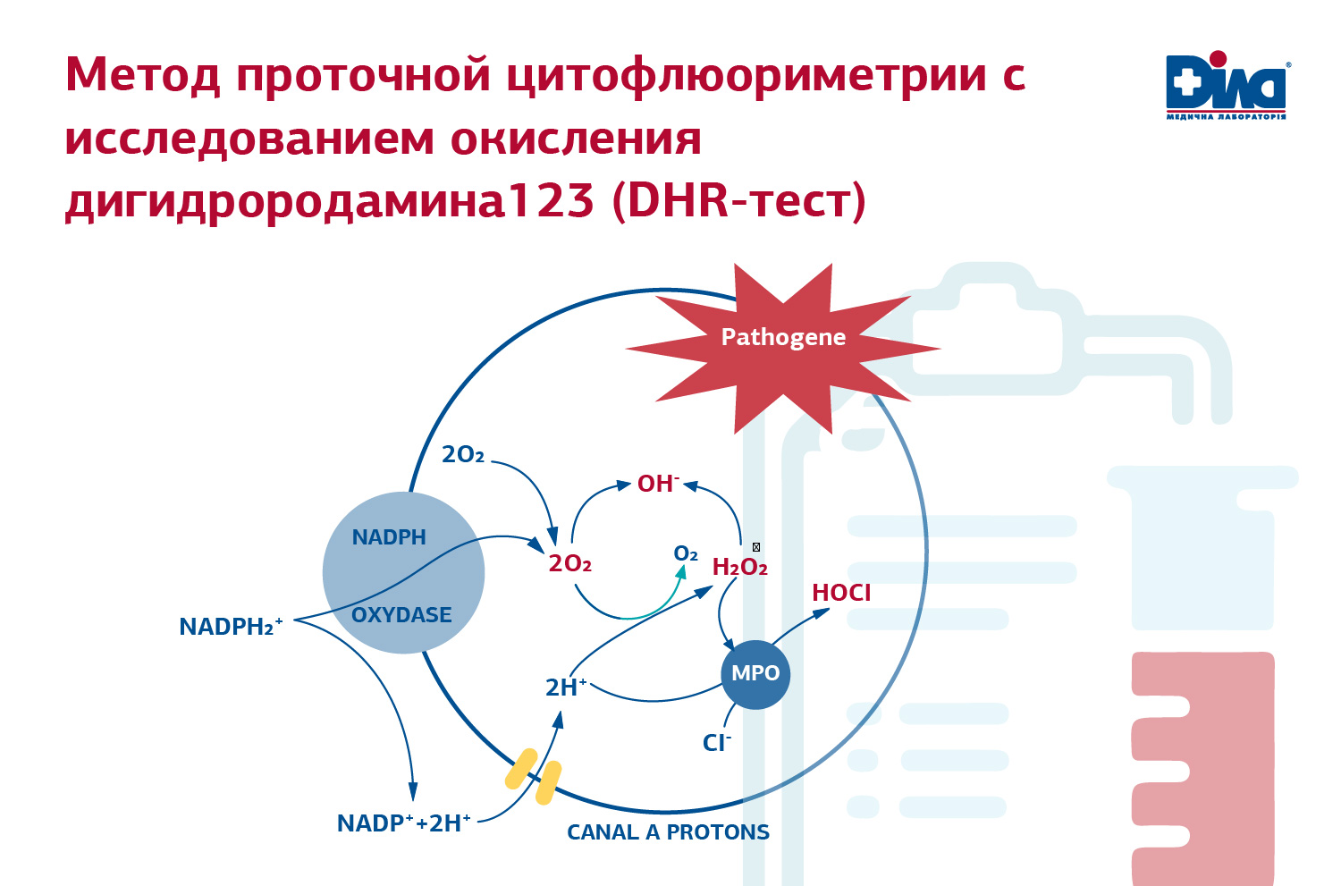 Оценка фагоцитарной активности – функциональной активности гранулоцитов – методом проточной цитофлюориметрии с исследованием окисления дигидрородомина 123 (DHR-тест) из коммерческих лабораторий Украины осуществляется эксклюзивно в ДІЛА и считается наиболее объективным методом и является «золотым стандартом».